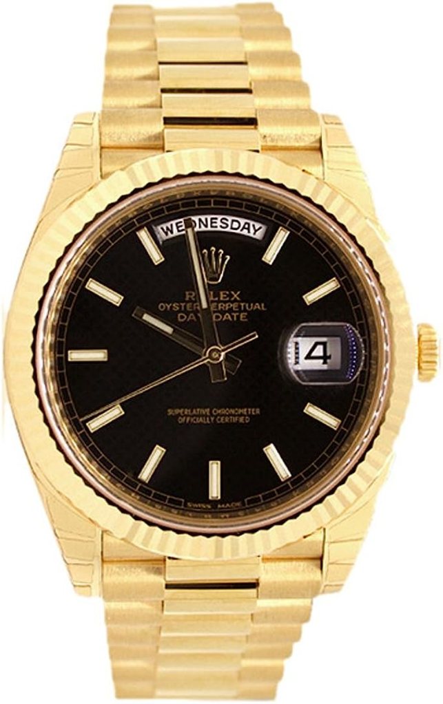 The Rolex Day-Date 40 Black Diagonal Motif Index Dial 418 Yellow Gold Men’s Watch 228238 stands as a testament to the pinnacle of Swiss watchmaking craftsmanship. Renowned for its impeccable design, precision engineering, and timeless style, Rolex has been an icon in the world of luxury timepieces for over a century. The Day-Date 40, in particular, represents the epitome of elegance and functionality, capturing the essence of sophistication with its distinctive features. Let’s delve into the world of the Rolex Day-Date 40 and discover why it is revered by collectors and connoisseurs alike.